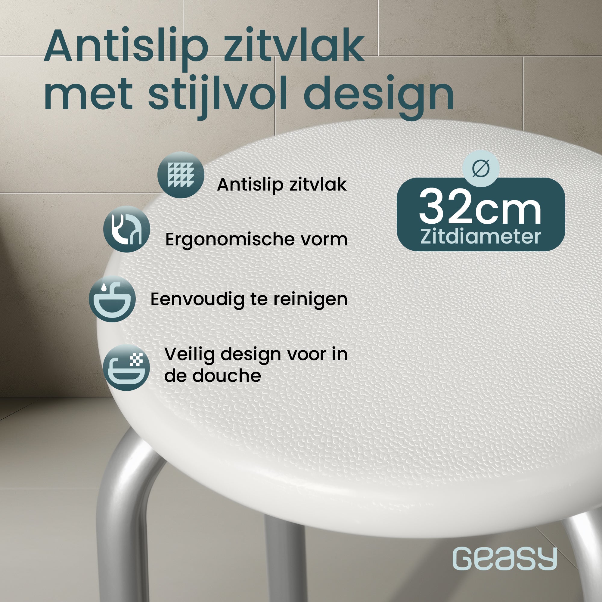 Dankzij het ronde zitvlak (Ø 32 cm) is de kruk compact, stabiel en geschikt voor vrijwel elke douche of badkamer.
