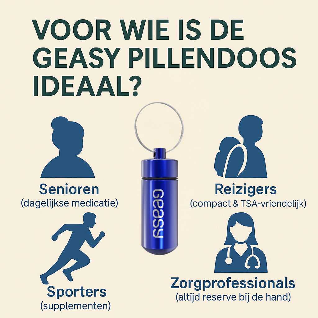 Een pillendoosje helpt je om medicijnen en supplementen overzichtelijk en veilig te bewaren. Of je nu dagelijks meerdere pillen slikt, of gewoon structuur wilt in je routine: bij Geasy.nl vind je de juiste pillendoos of pillendoosje voor jouw situatie.
